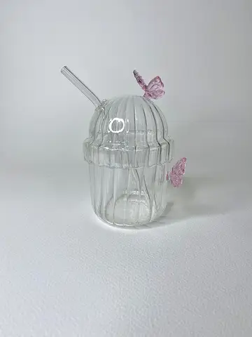 ماگ اسموتی پروانه ای صورتی با بدنه پیرکس و دو پروانه برجسته، نی پیرکس و درب شیاردار؛ خاص، مقاوم و عاشقانه! همین امروز از فروشگاه اینترنتی ماگوریا خرید کن 💕